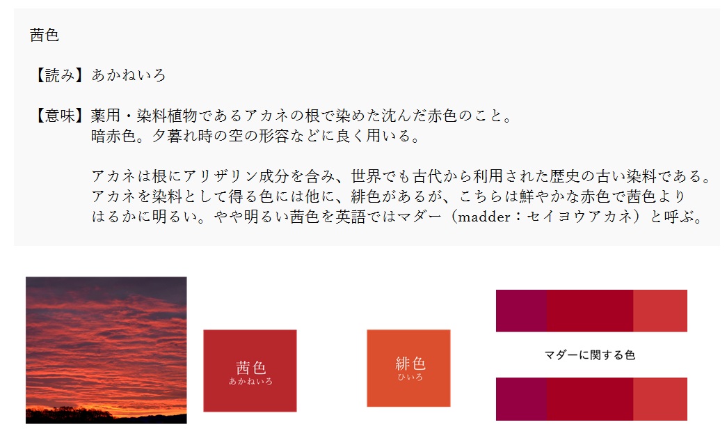 茜 | 茜草の根で染めた暗い赤色 | 解説 |