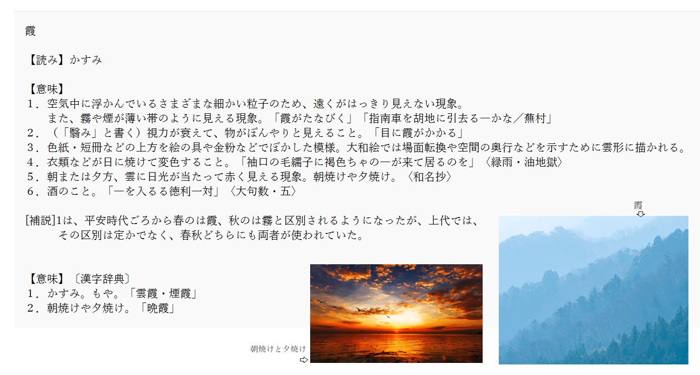 霞 | 空気中に浮かんでいる水滴や塵 | 解説 |