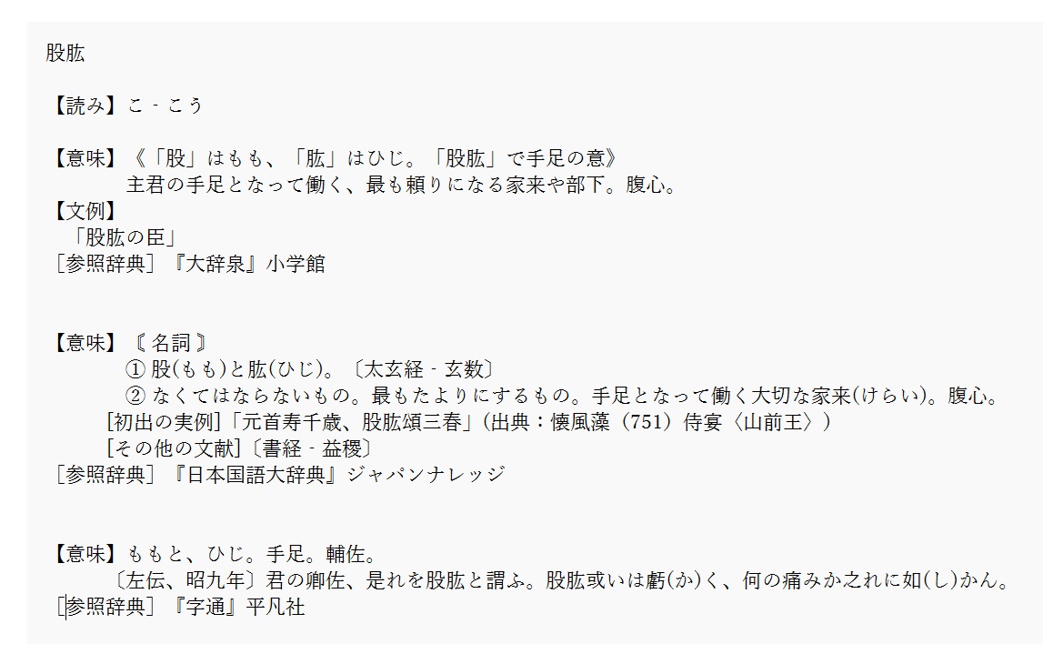 股肱 | 最も頼りになる家来や部下。腹心 | 解説 |
