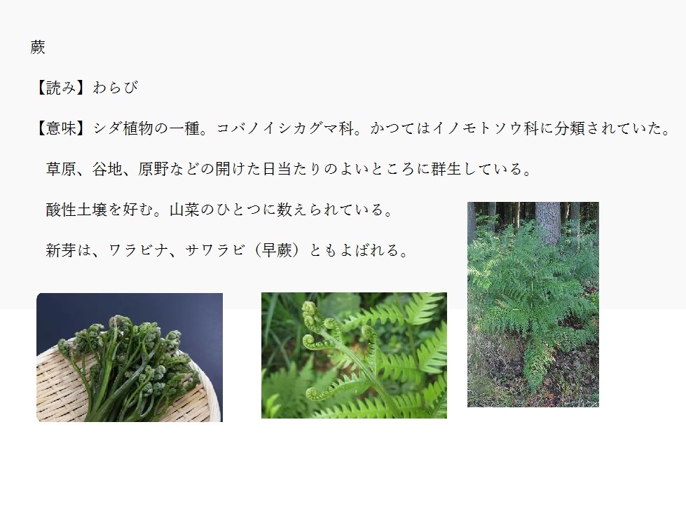 | 2 | 山道のわきにワラビを見つける | |