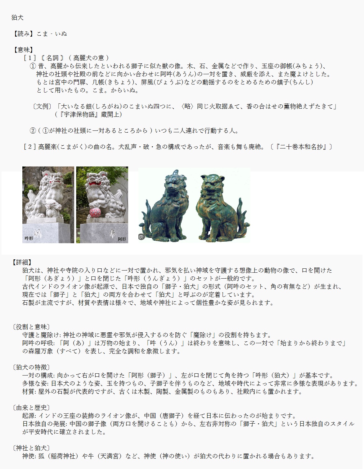 狛犬 | 神社などに置かれる獅子に似た像 | 解説 |