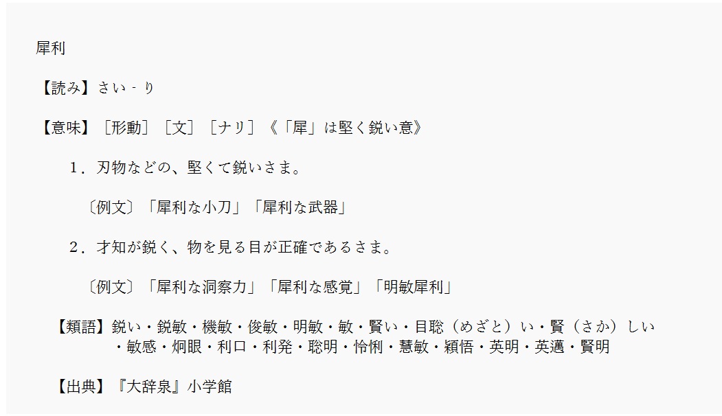 犀利 | 才知鋭く、見る目が正確であるさま | 解説 |