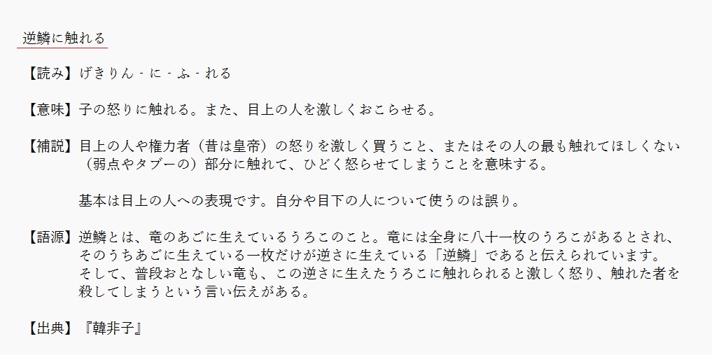 逆鱗 | 弱点に触れて、強い怒りを買う | 解説 |