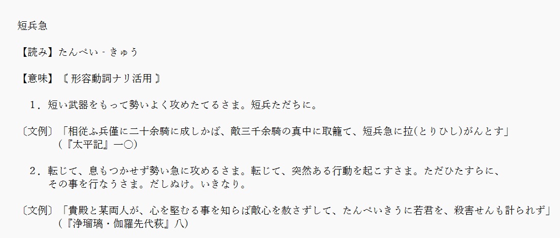 短兵急 | にわかに行動を起こすさま。だしぬけ | 解説 |