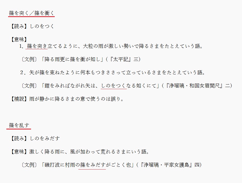 篠突 | 雨が激しい勢いで降るさま | 解説 |