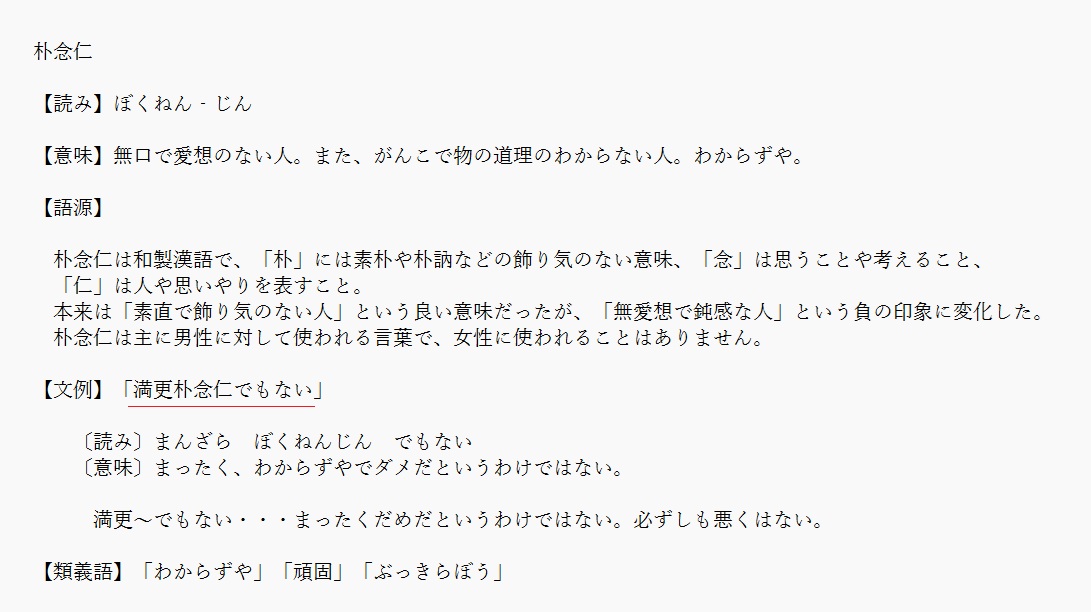 朴念仁 | 無口で不愛想な人。頑固者 | 解説 |